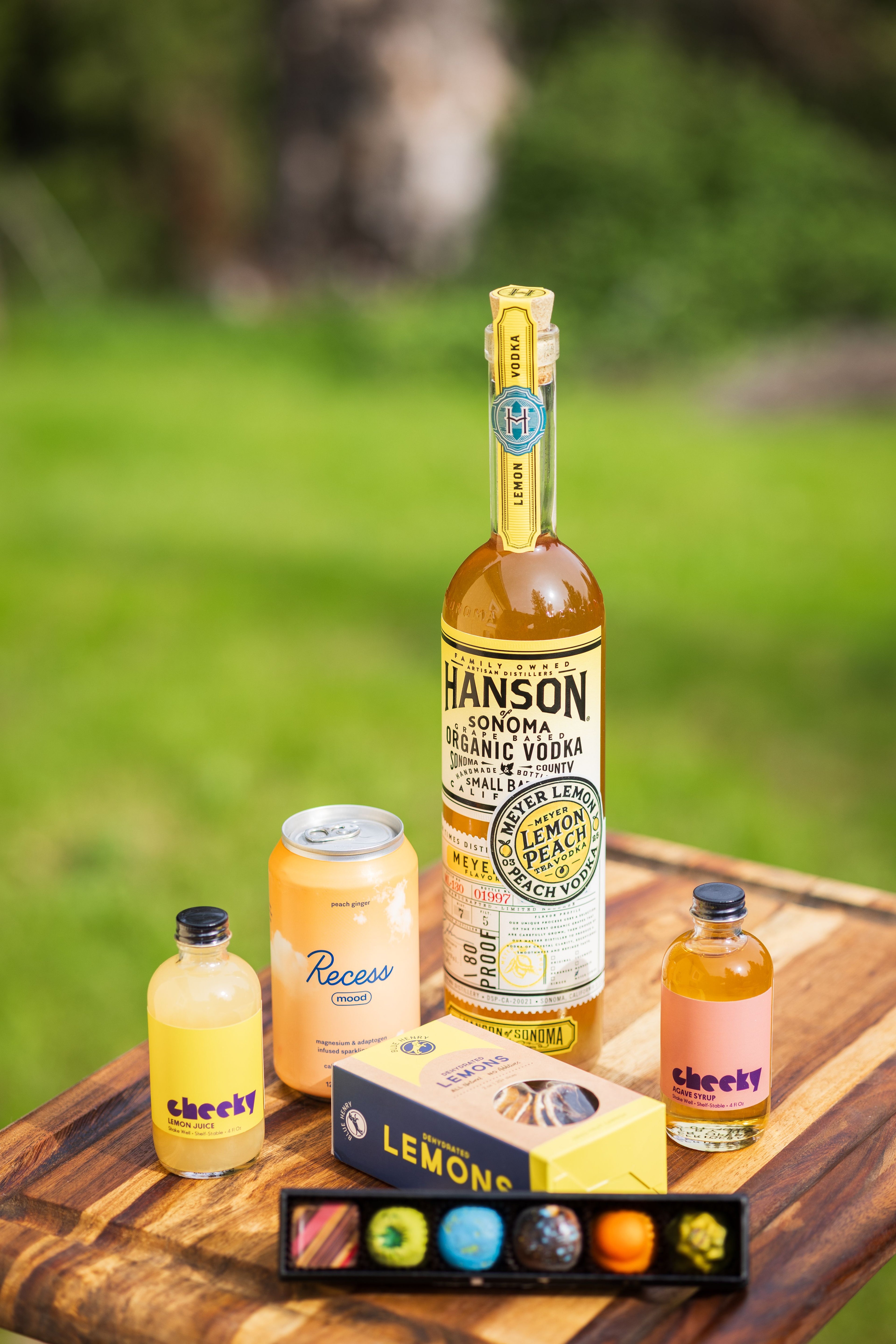 1 Bottle of Hanson Meyer Lemon Peach Tea Vodka, 1 Bottles of Recess Mood-Boosting Sparkling Peach Ginger, 1 Bottle of Organic Agave, 1 Bottle of Lemon Juice, 1 recipe card to make the Calmer Palmer and Kollar Chocolates