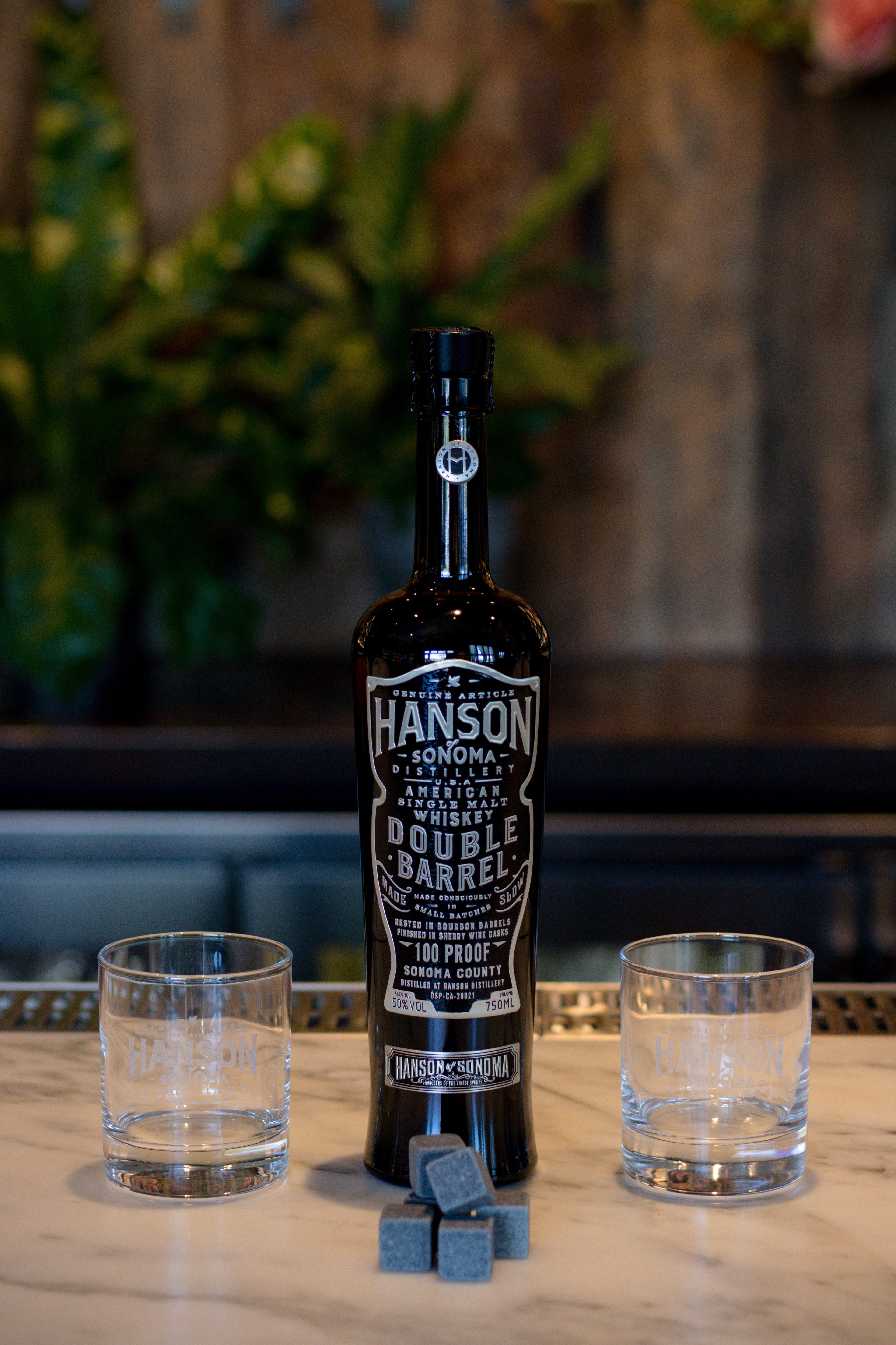 1 Bottle of Hanson Single Malt Whiskey, 2 Hanson Branded Old Fashioned Glasses, 1 Box of Whiskey Stones