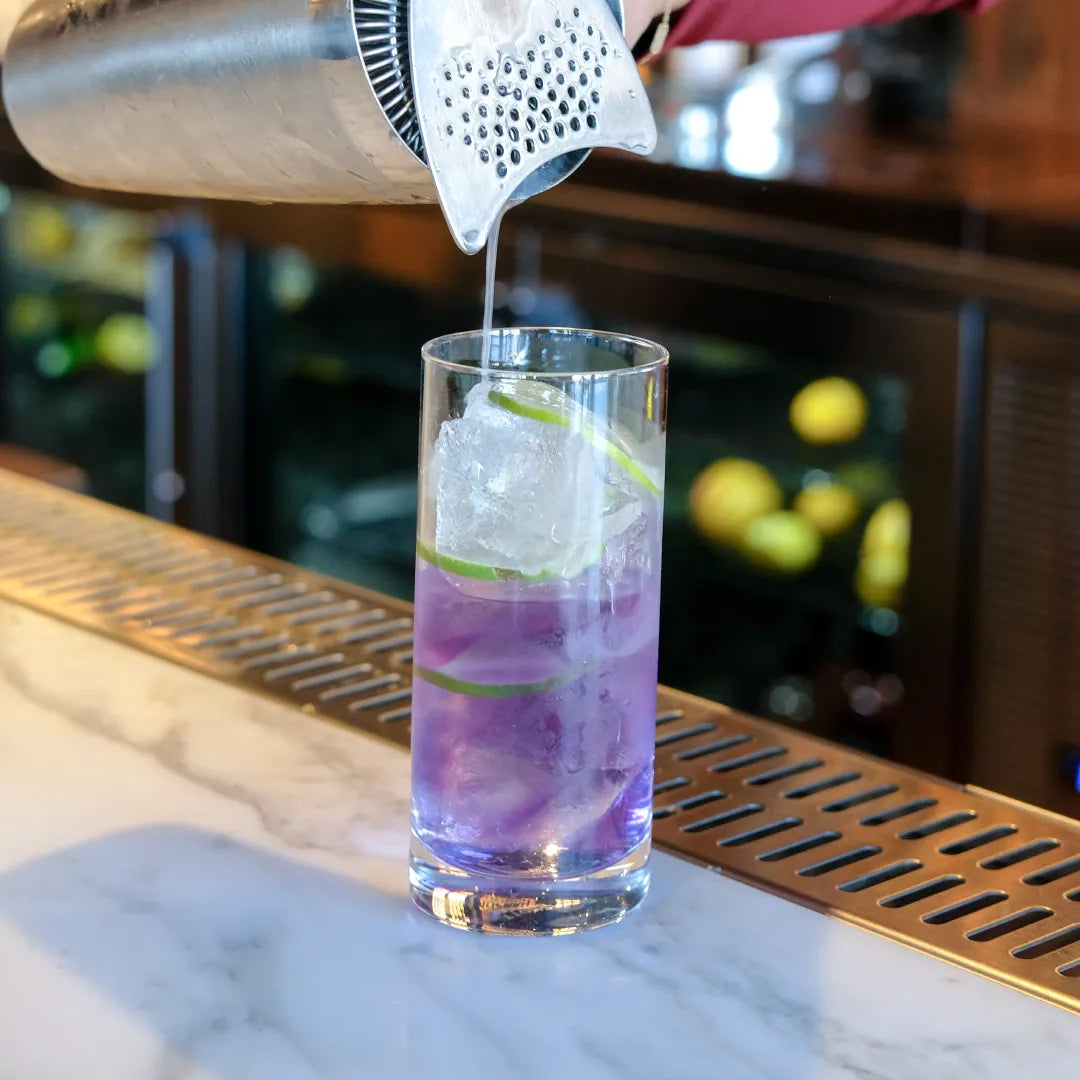 The Inked cocktail is delicious and visually stunning, changing color thanks to blue butterfly pea flowers infused with Hanson’s Organic Cucumber Vodka. Lime juice, agave nectar, and tonic water transform the blue hue to vibrant purple.