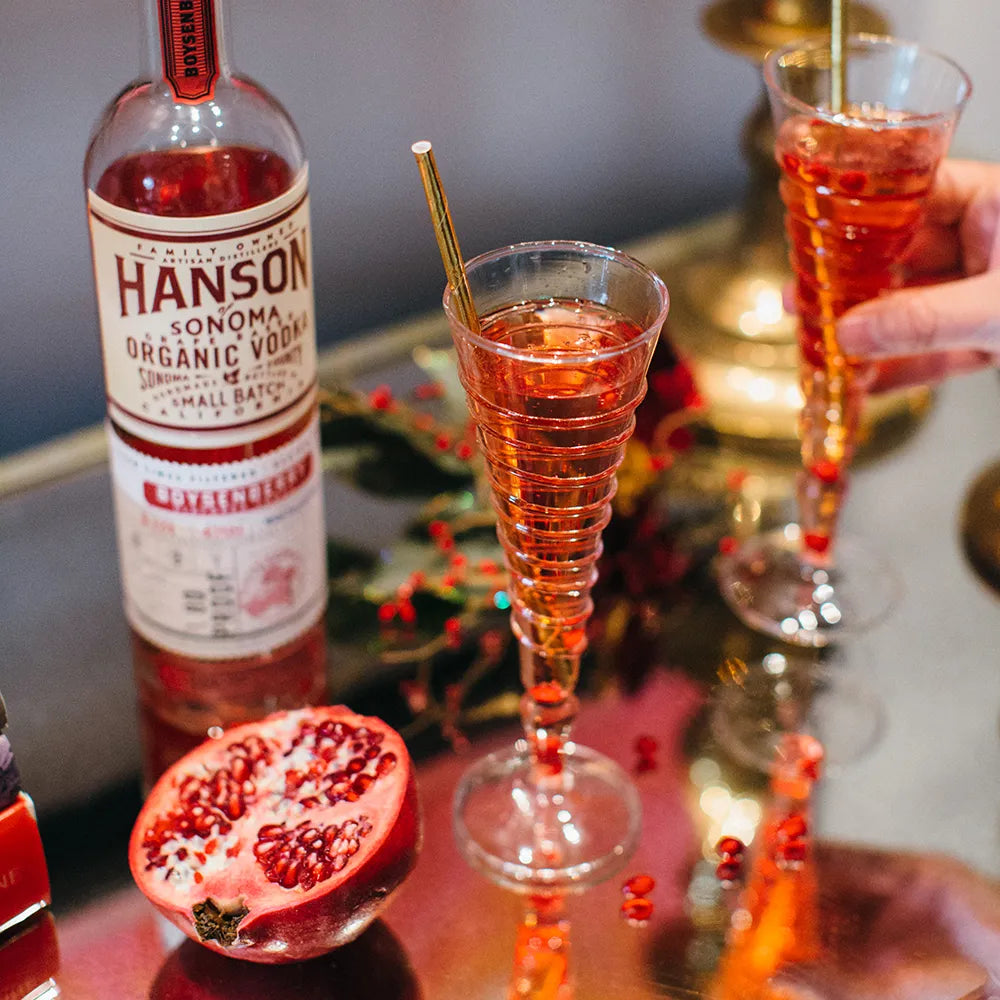 The Pomm Fizz, made with Hanson Organic Boysenberry Vodka, is a delicious, refreshing cocktail combining sweet pomegranate juice and complex boysenberry vodka flavors. Its bright, vibrant pink appearance is visually appealing, matching the sweet, fruity flavors.
